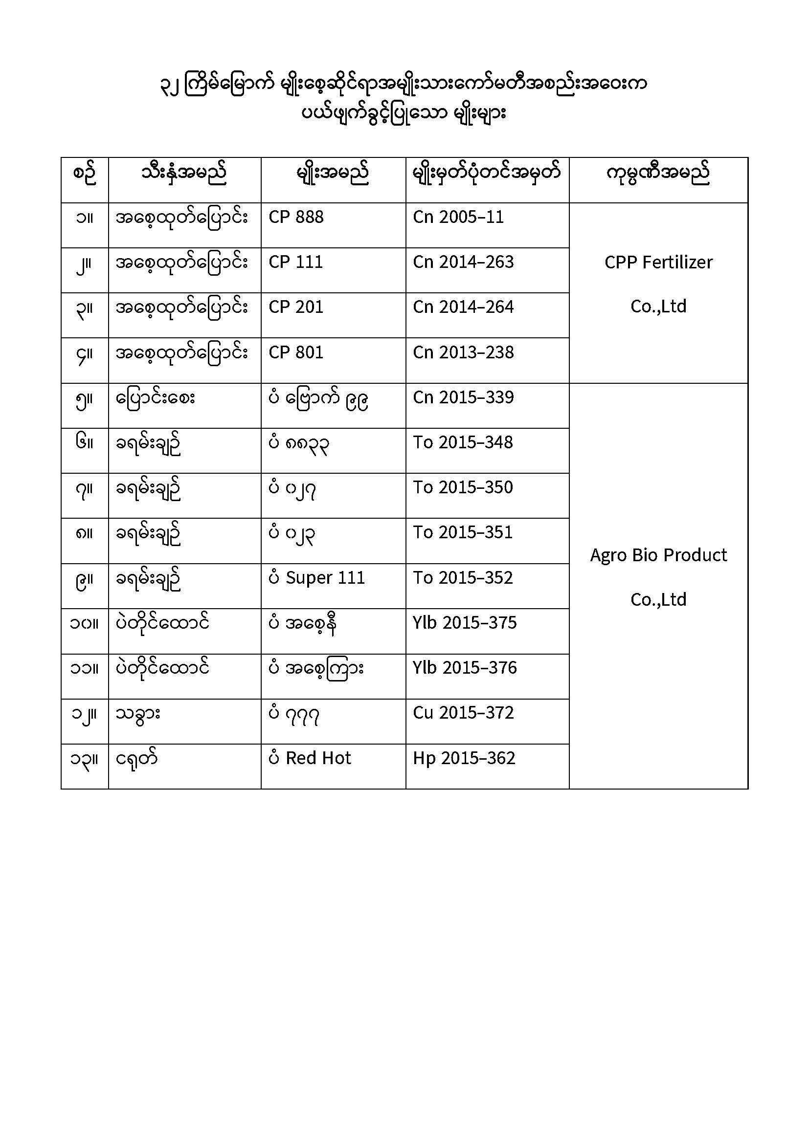 Home » News » Latest News » ၃၂ ကြိမ်မြောက်မျိုးစေ့ဆိုင်ရာ အမျိုးသားကော်မတီမှ ပယ်ဖျက်ခွင့်ပြုသော မျိုးများ