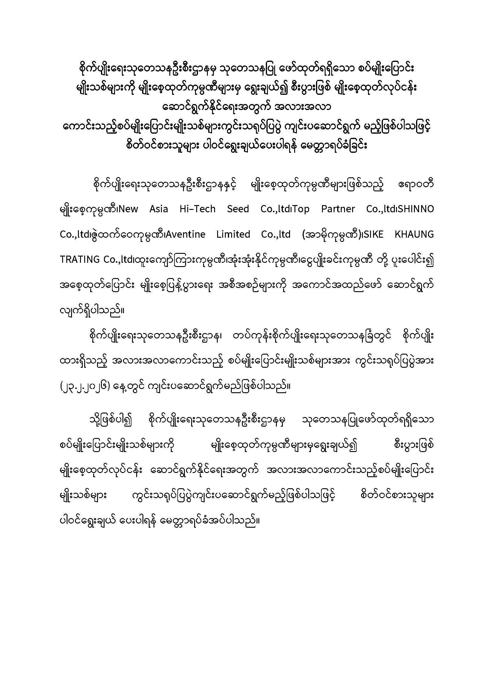 မျိုးစေ့ထုတ်လုပ်သူများ သိရှိလိုက်နာရမည့်အချက်များ